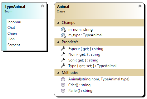 TypeLe type de l'animal de l'énumération en lecture seul. (ex.:TypeAnimal.Chat) Vérifiez que l'enumne sort pas des options possible. Affectez le typeTypeAnimal.Inconnusi la valeur n'est pas valide.NomLe nom de l'animal en lecture seul.SonUne propriété calculée qui retourne le son d'un animal en fonction de son type. ("Miaou", "Wouf", "Roar", "Ssss", "????")EspeceUne propri été calculée qui retourne le nom de l'espèce de l'animal en chaîne de caractère en fonction de son type.