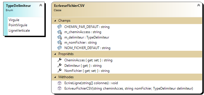 CheminAccessGarde en mémoire le répertoire où sera enregistré le fichier. (C:/EspaceLabo). Cette propriété est en lecture seule à l’extérieur de la classe. Si le chemin n'existe pas, la propriété devrait retourner leCHEMIN_PAR_DEFAUT.NomFichierGarde en mémoire le nom du fichier qui sera enregistré. (fichierVirgule.csv). Cette propriété est en lecture seule à l’extérieur de la classe. Si le fichier n'est pas valide(longueur plus petite que zéro?), la propriété devrait retourner leNOM_FICHIER_DEFAUT.DelimiteurUne propriété calculé qui retourne la valeur string en fonction du délimiteur contenu dansm_type.