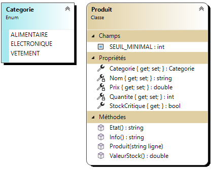 La classe Produit et le type par énumération Categorie sont fournies. Il ne faut pas les modifier.