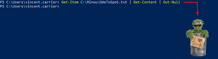 Si on souhaite se débarrasser de l'objet résultant, il suffit de terminer la chaîne de pipeline par la commande Out-Null, qui désigne simplement une sortie vers rien du tout.