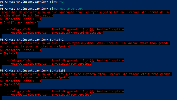 Par défaut, les nombres entiers sont de type [int32] (ou [int64] s'il sont trop grands). Pour qu'ils soient de type différent, il faut le spécifier devant la valeur. (Par exemple, [uint32]42).