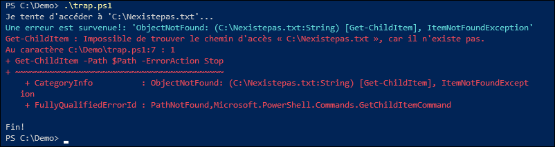 Pour qu'elle tombe dans le piège, il est important que l'erreur puisse déclencher l'arrêt du traitement. Les erreurs de fin d'exécution (terminating) tombent automatiquement dans le piège. Pour les erreurs régulières, il faut qu'elles déclenchent l'action Stop, soit en spécifiant le paramètre -ErrorAction Stop, soit en affectant la valeur "Stop" à la variable $ErrorActionPreference.
