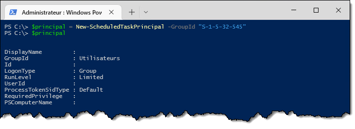 Le principal de sécurité (Principal) décrit avec quelle identité (un compte utilisateur ou un groupe) la tâche sera lancée. Si le principal est un compte utilisateur, alors c'est sous ce compte que la tâche sera exécutée (comme si l'utilisateur l'avait fait manuellement). Si le principal est un groupe, la tâche sera lancée au nom de l'utilisateur courant uniquement s'il est membre de ce groupe.