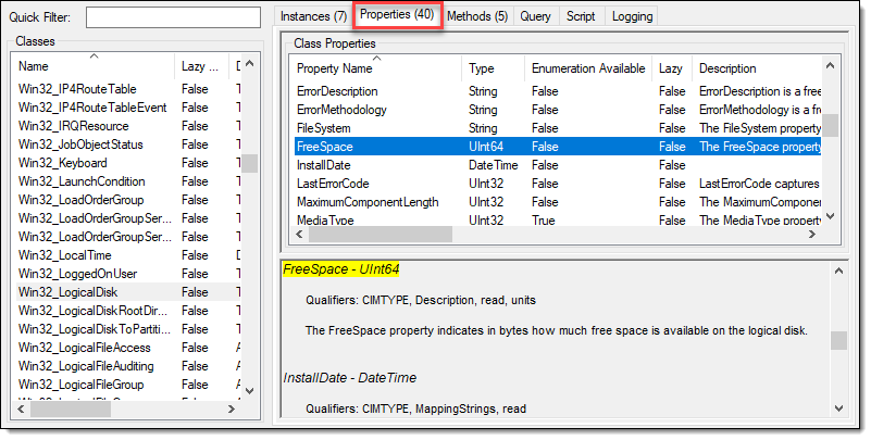 Dans l'onglet Properties, vous avez une liste de toutes les propriétés de la classe sélectionnée, tirée de la documentation de WMI.