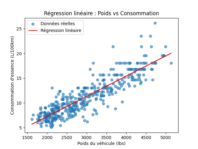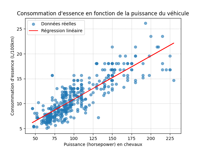 Utilisez 🤖 Scikit-learn pour créer un modèle de régression linéaire simple qui prédit la consommation l_par_100km en fonction de la puissance (horsepower).