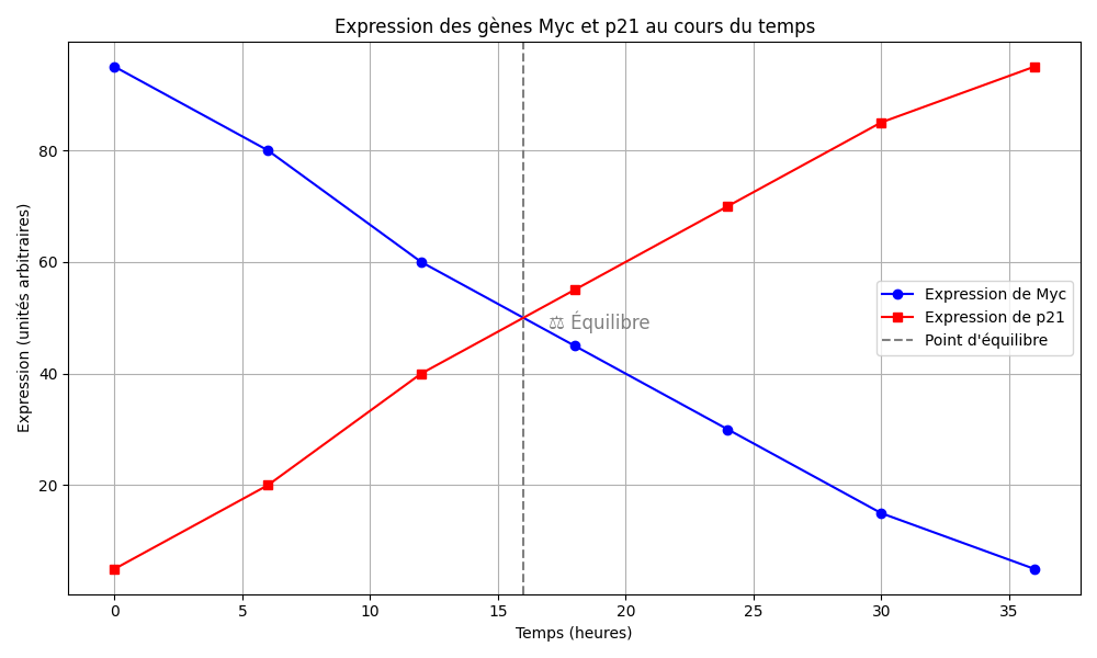 Les gĂšnes Myc et p21 rĂ©gulent le cycle cellulaire de maniĂšre opposĂ©e : Myc stimule la prolifĂ©ration cellulaire en activant des gĂšnes liĂ©s Ă la croissance, tandis que p21 freine cette progression en bloquant les enzymes responsables de la division. On les Ă©tudie en science parce quâils jouent un rĂŽle clĂ© dans le dĂ©veloppement du cancer, Myc par sa capacitĂ© Ă favoriser les tumeurs, et p21 par son potentiel Ă les empĂȘcher. Ces 2 gĂšnes exercent souvent des effets opposĂ©s dans les cellules souches.