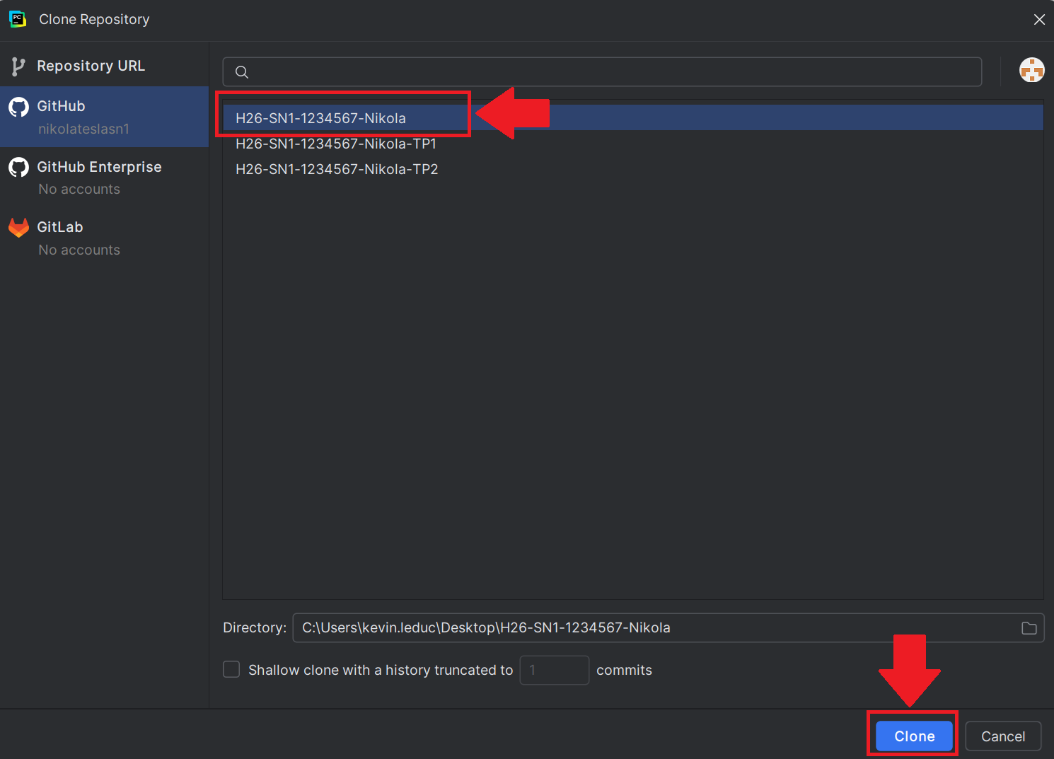 - Choisir le dépÎt que vous souhaitez cloner sur votre machine et cliquer sur le bouton « Clone » (en bas)