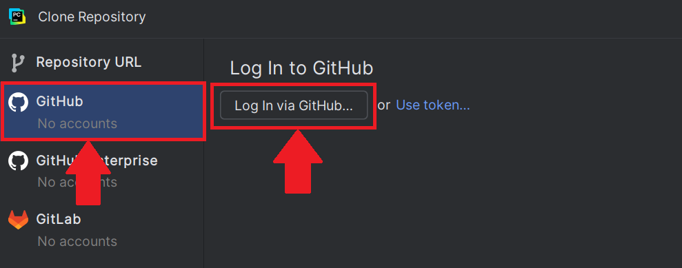 - à gauche, cliquez sur « GitHub », puis sur « Log In via GitHub⊠»